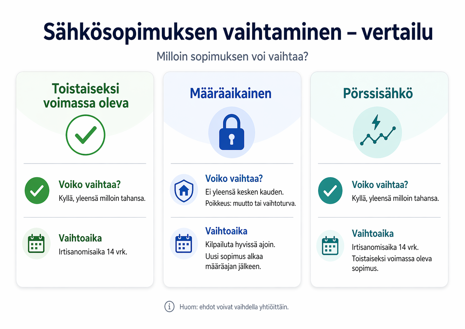 - Voiko vaihtaa? Määräaikainen sopimus on voimassa sovitun ajan. Määräaikaisen sähkösopimuksen voi kuitenkin vaihtaa kesken sopimuskauden, kun muutat. Jos olet ostanut erillisen vaihtoturvan, voit myös käyttää sitä sopimusehtojen mukaisesti.